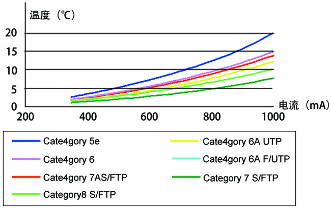從圖表我們可以看到,隨電流增大,網(wǎng)線的溫度也隨著增加。當(dāng)相同電流時(shí),網(wǎng)線類別越高,溫度越低。