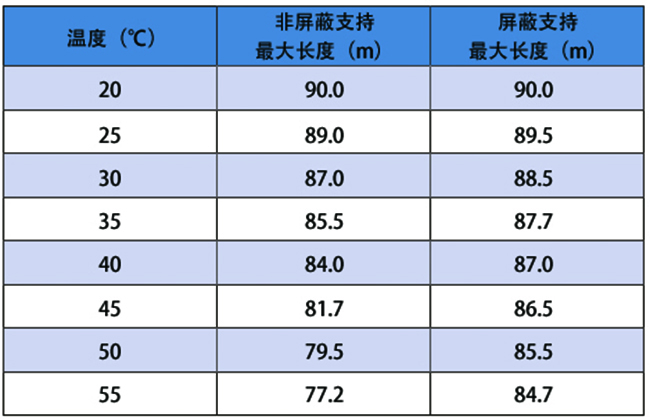 下圖為不同環(huán)境溫度下網(wǎng)線支持的最大長(zhǎng)度: