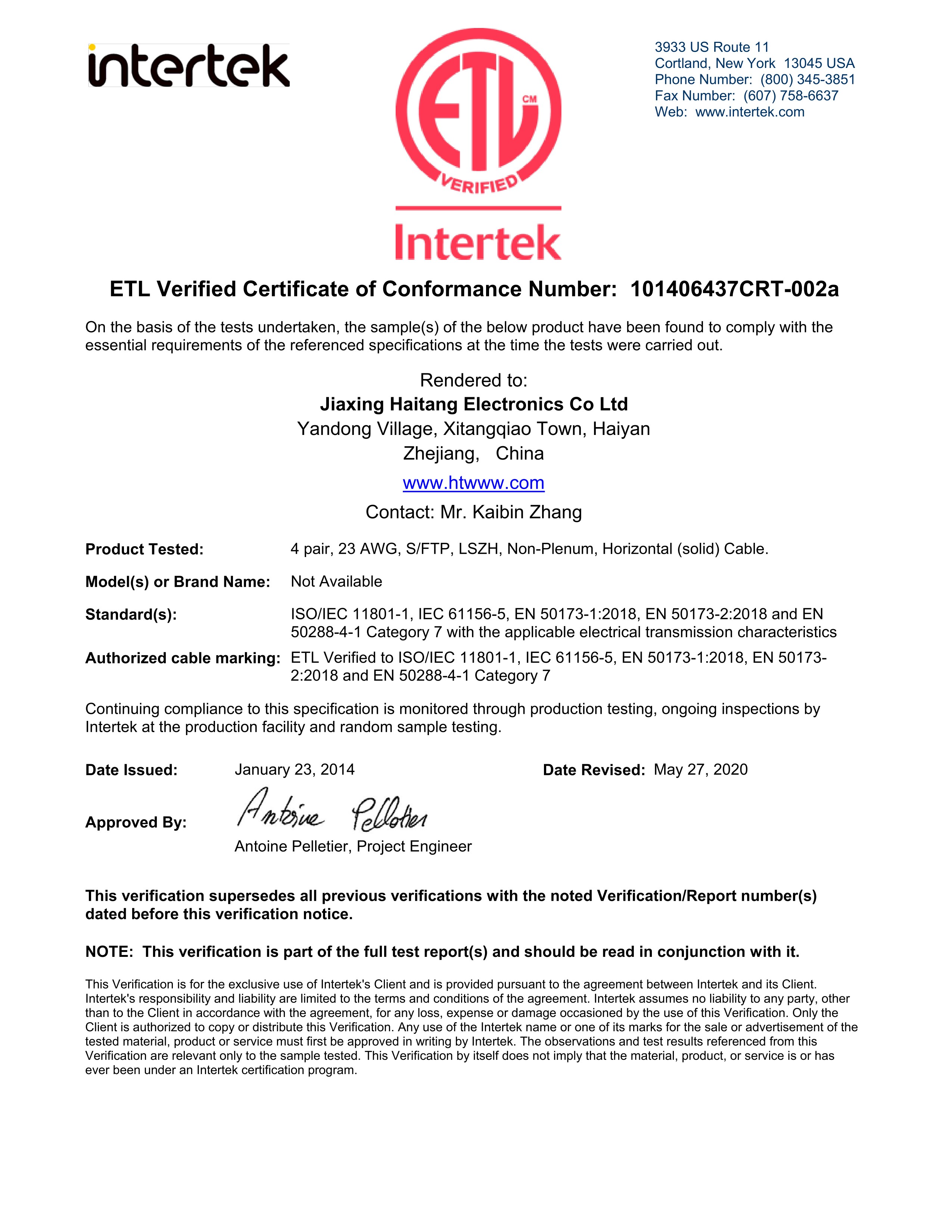 UFTP CAT6A 23AWG LSZH ETL性能認(rèn)證