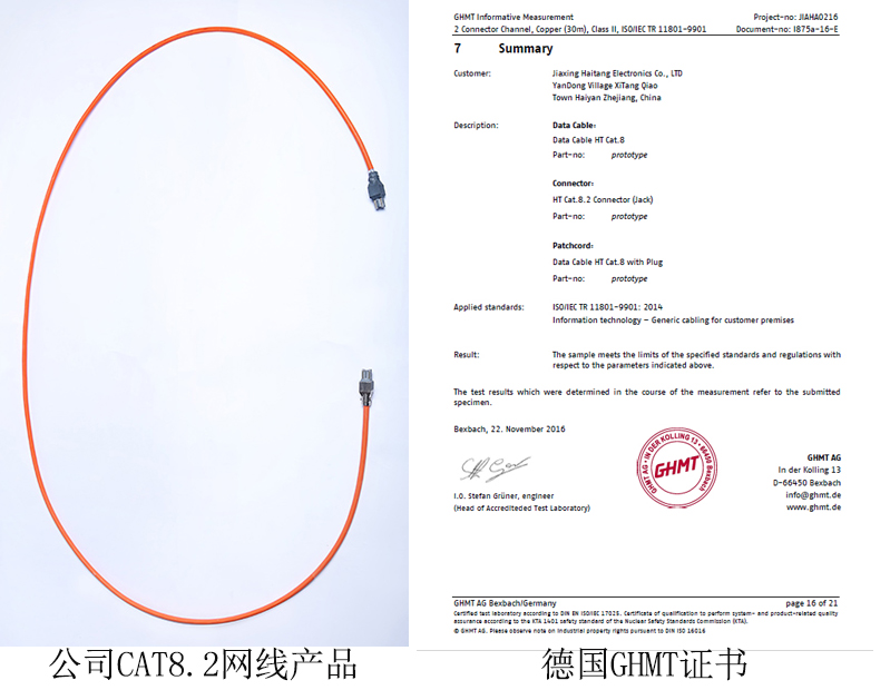 2015年海棠電子依靠過(guò)硬的技術(shù)攻關(guān)實(shí)力在國(guó)內(nèi)研發(fā)出了第一款符合八類標(biāo)準(zhǔn)的通信網(wǎng)線,并獲得了GHMT國(guó)際認(rèn)證。海棠電子8類配套模塊“一種強(qiáng)化網(wǎng)絡(luò)傳輸屏蔽功能的CAT8網(wǎng)線插頭”、“一種強(qiáng)化網(wǎng)絡(luò)傳輸屏蔽功能的CAT8網(wǎng)線接頭”已獲得發(fā)明專利授權(quán)。