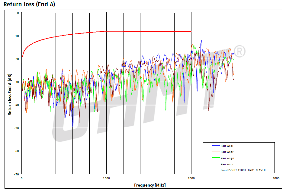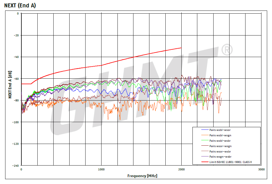 從測(cè)試結(jié)果可以看到,海棠電子8類網(wǎng)線在頻率為2GHz時(shí),插入損耗、近端串?dāng)_、回波損耗等傳輸性能均符合要求,并且各項(xiàng)傳輸性能在2000Hz頻率點(diǎn)后非常平穩(wěn),沒(méi)有形成尖峰,傳輸性能非常優(yōu)異。